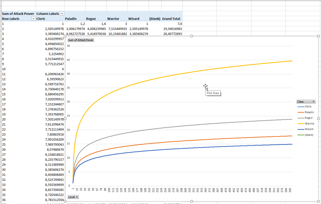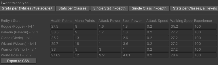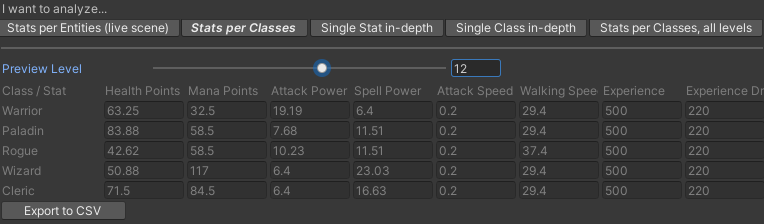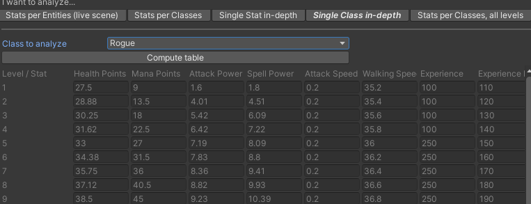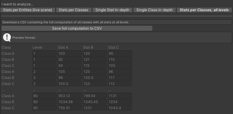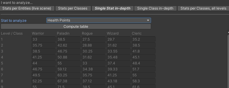 This advanced view does not show a table since it would be quite big and poorly useful in the editor. It gives all the combination of classes, stats and levels possible to export so you can work in a Spreadsheet. See the CSV export and Spreadsheet section for more info.